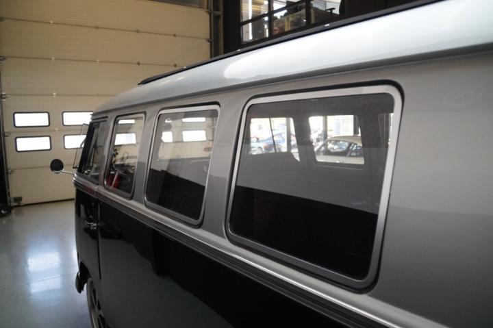 The striking black and silver two-tone paint perfectly suits the elegant lines of the T1 and gives the bus a refined and timeless appearance. The high-end paintwork was executed using period-correct Porsche colors, a subtle detail that adds an extra level of sophistication to the overall build.